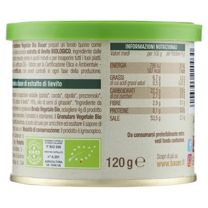 Bio Instant-Granulat, Bauer, 120 g. Mit dem Bauer Bio Instant-Granulat bereiten Sie eine Brühe zu, wie Sie sie mögen. Dank des wertvollen Bio-Hefeextrakts, einer ernährungsphysiologischen Zutat, ist sie ideal für Brühen und Suppen, die in wenigen Minuten fertig sind, um all Ihre Gerichte zu würzen.